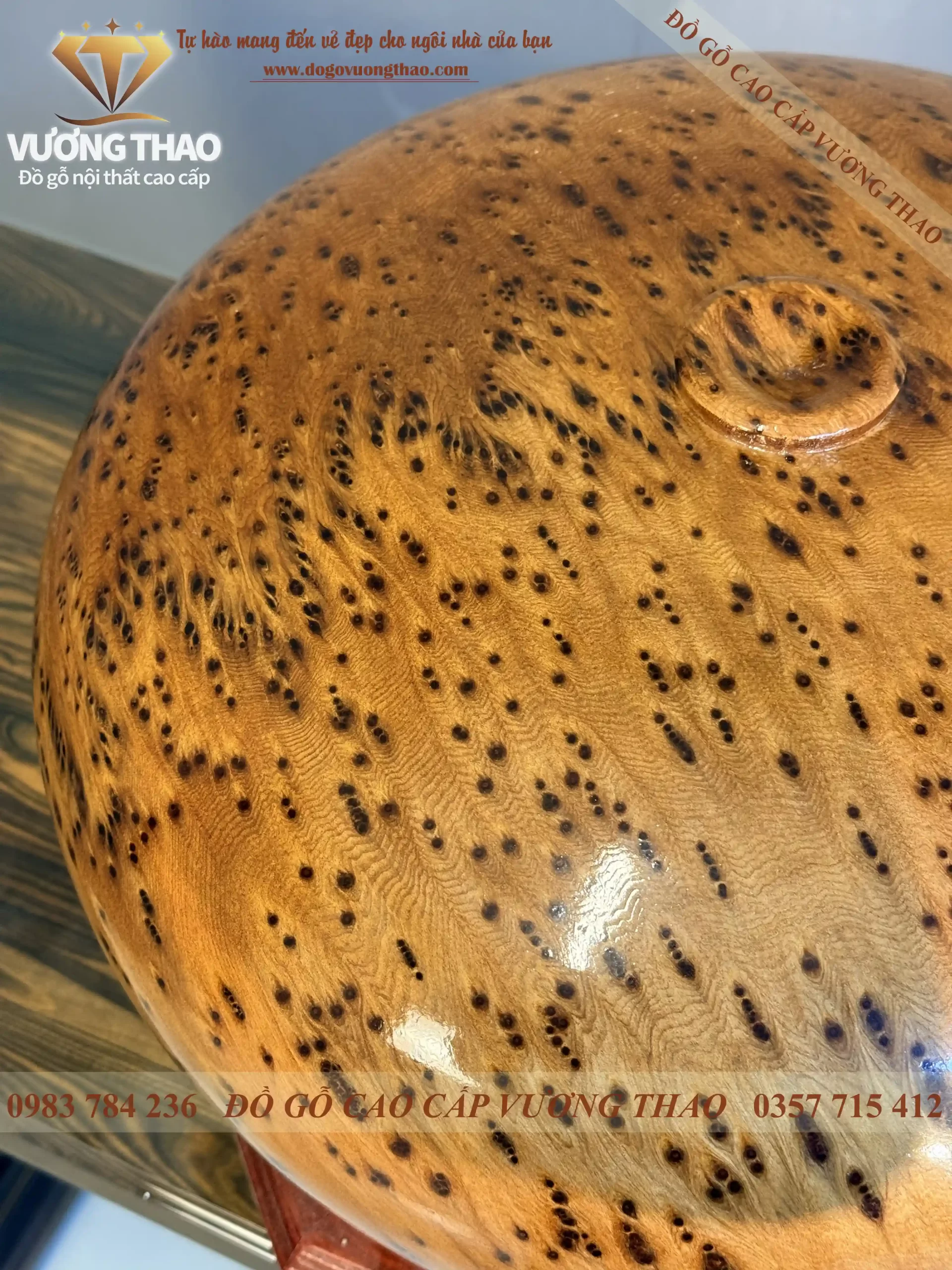 Điểm đắt giá của tác phẩm này chính là sự nguyên khối của tác phẩm. Để tìm được một khối nu có kích thước to như bình đường kính 76cm mà không bị chắp ghép là điều cực kỳ hiếm thấy. Bề mặt hiện lên những đốm vân dày đặc như những vì sao. Độ bóng mịn của bề mặt gỗ kết hợp với màu vàng óng của Ngọc Am tạo nên một vẻ đẹp lộng lẫy, thách thức mọi ánh nhìn.