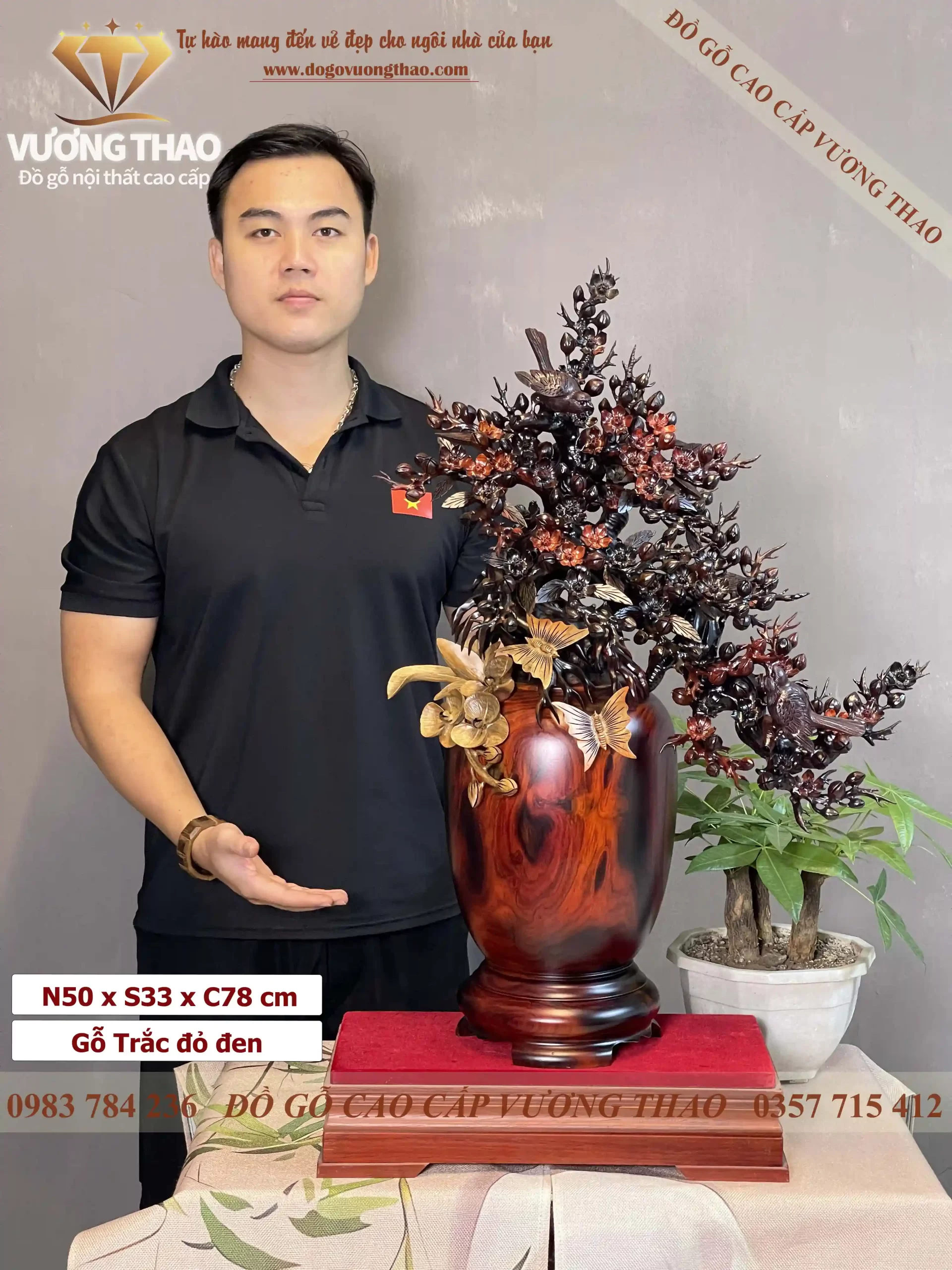 Bình Mai Phú Quý gỗ Trắc đỏ đen kích thước N57 x S34 x C74 cm với bình được làm nguyên khối, họa tiết chim muông và hoa Mai được đục chạm tỉ mỉ, chi tiết. Thuộc phân khúc cao cấp của đồ gỗ Vương Thao.