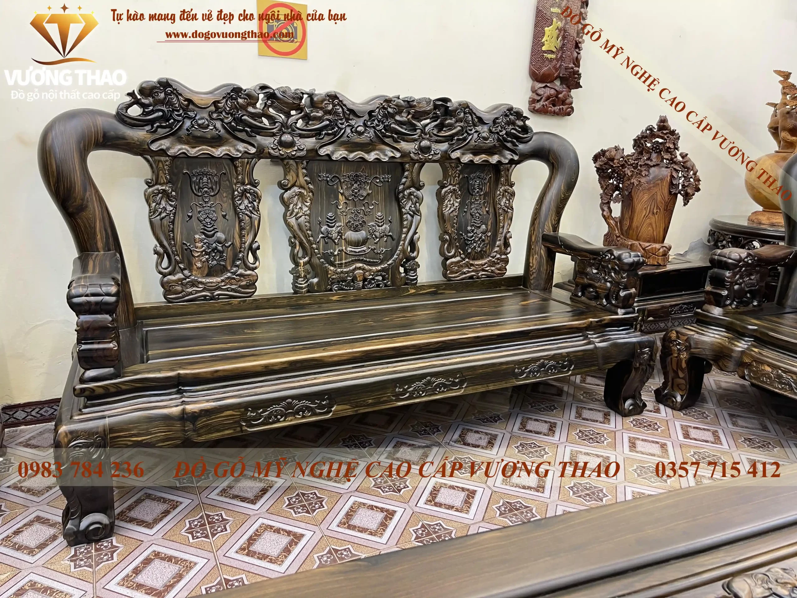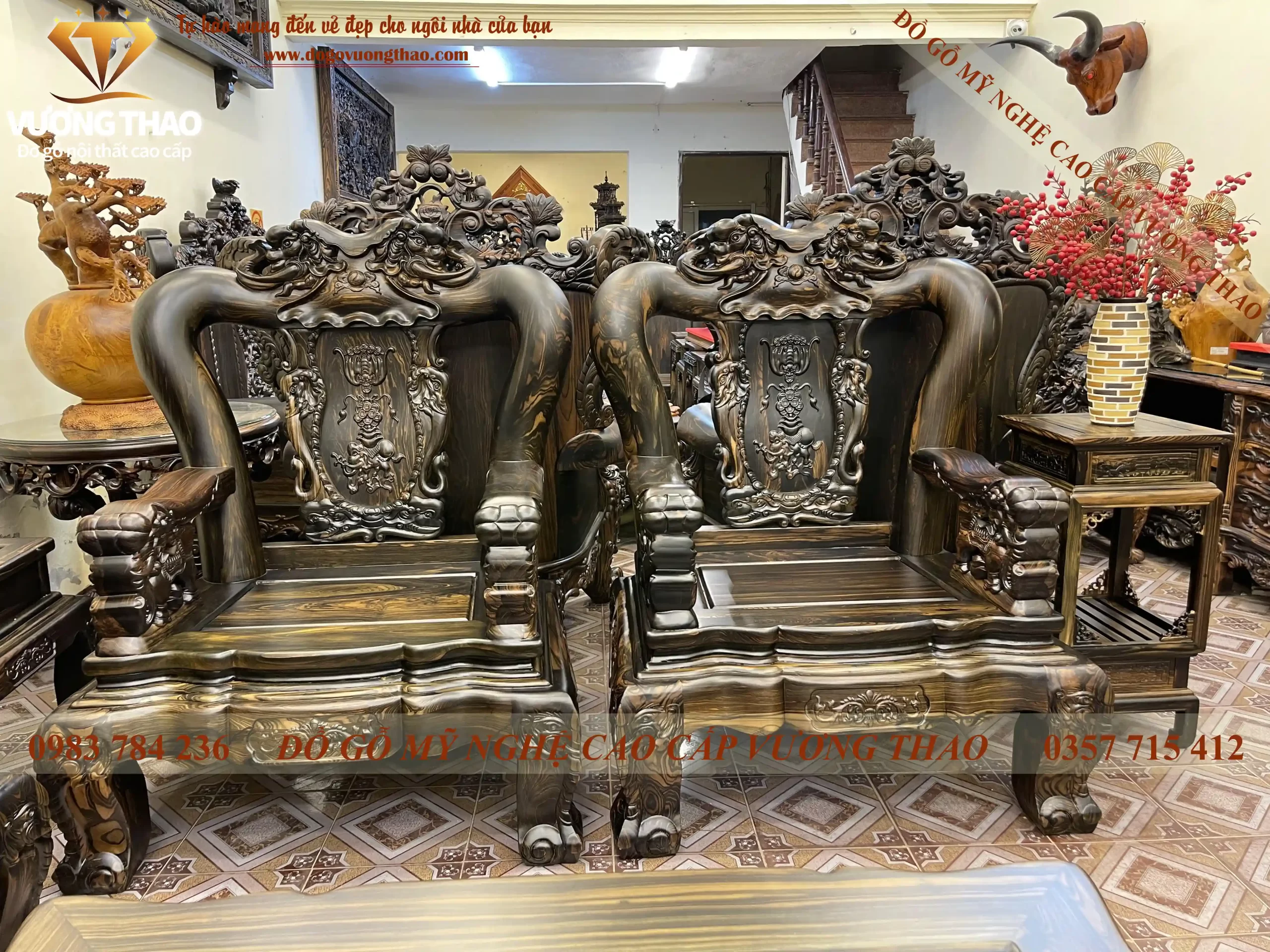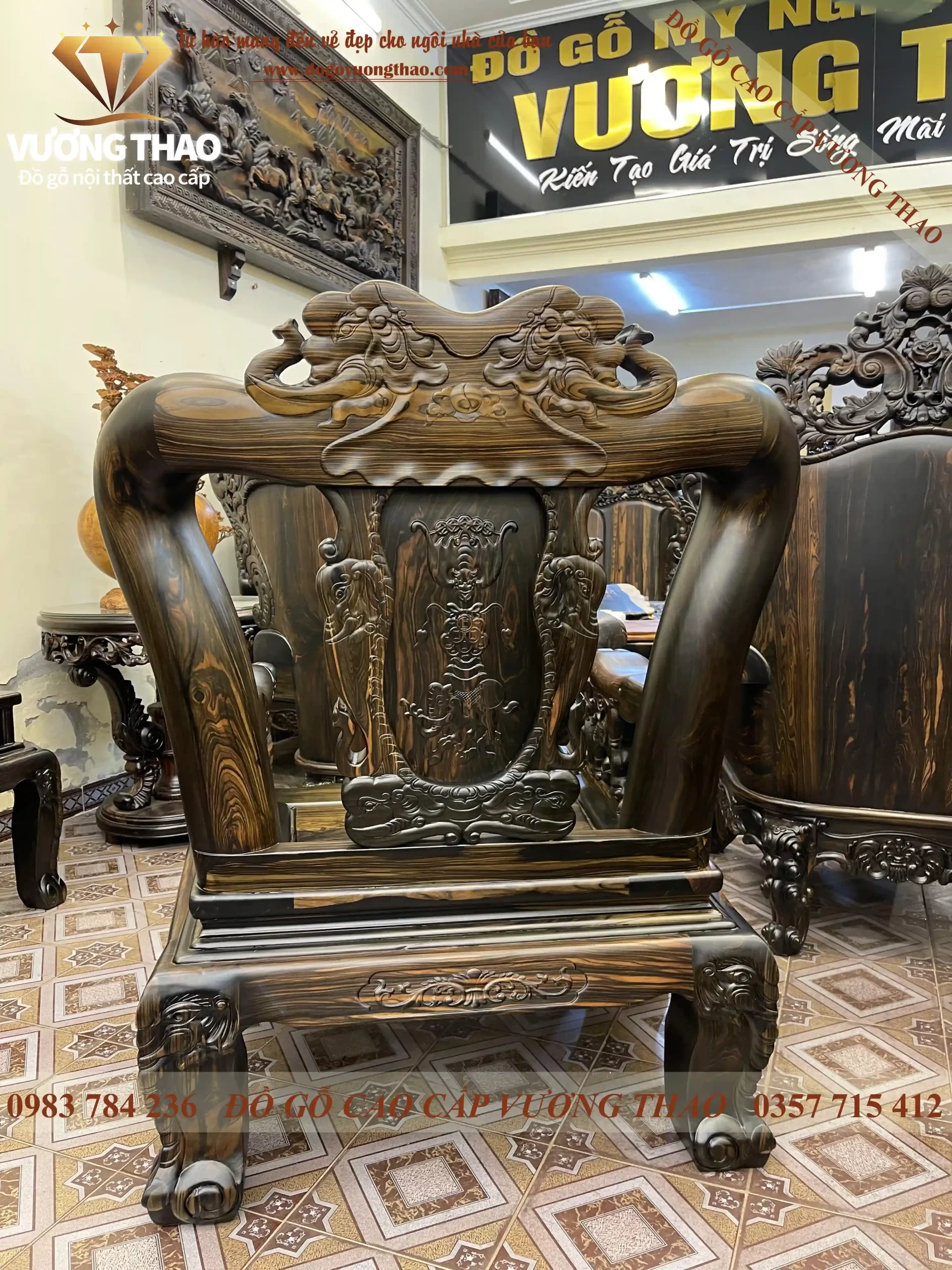 Với thiết kế không quá cầu kỳ nhưng lại vô cùng sắc nét, đục sâu và sạch sẽ làm cho bộ bàn ghế vô cùng tinh tế, sang trọng. Đặc biệt trên nền của vân gỗ mun hoa đen vàng đã góp phần tạo nên sự huyền bí và thẩm mỹ cao.