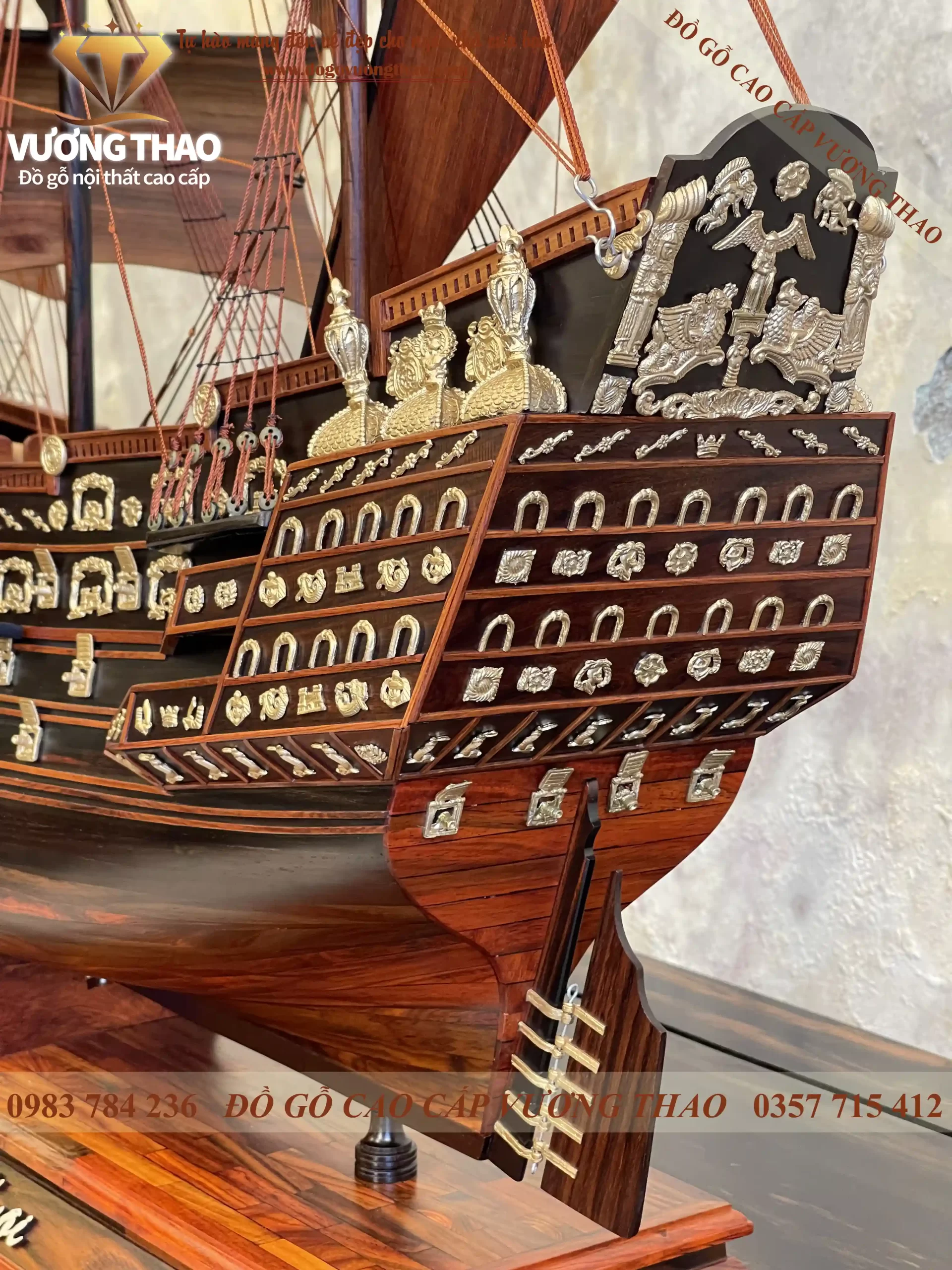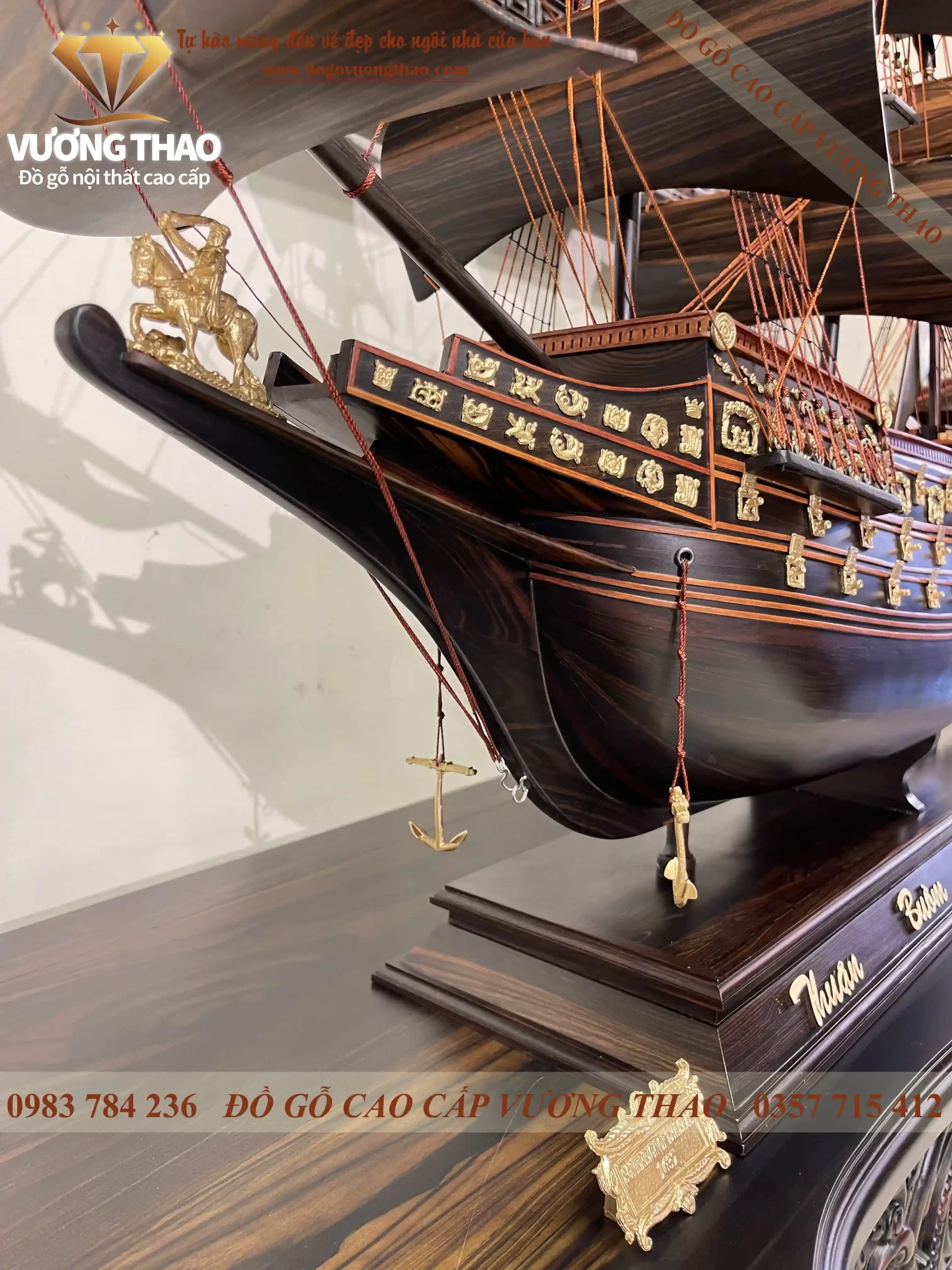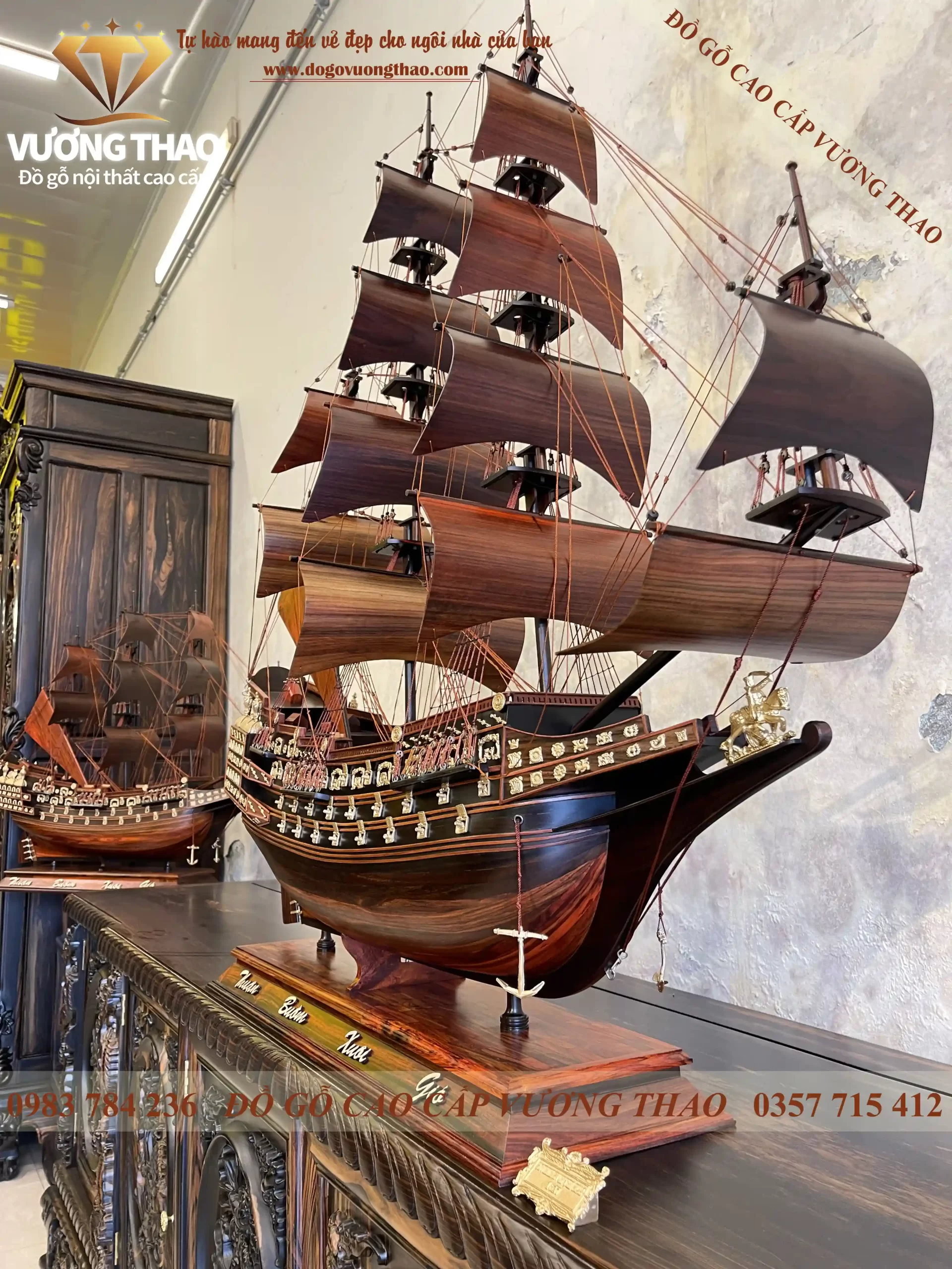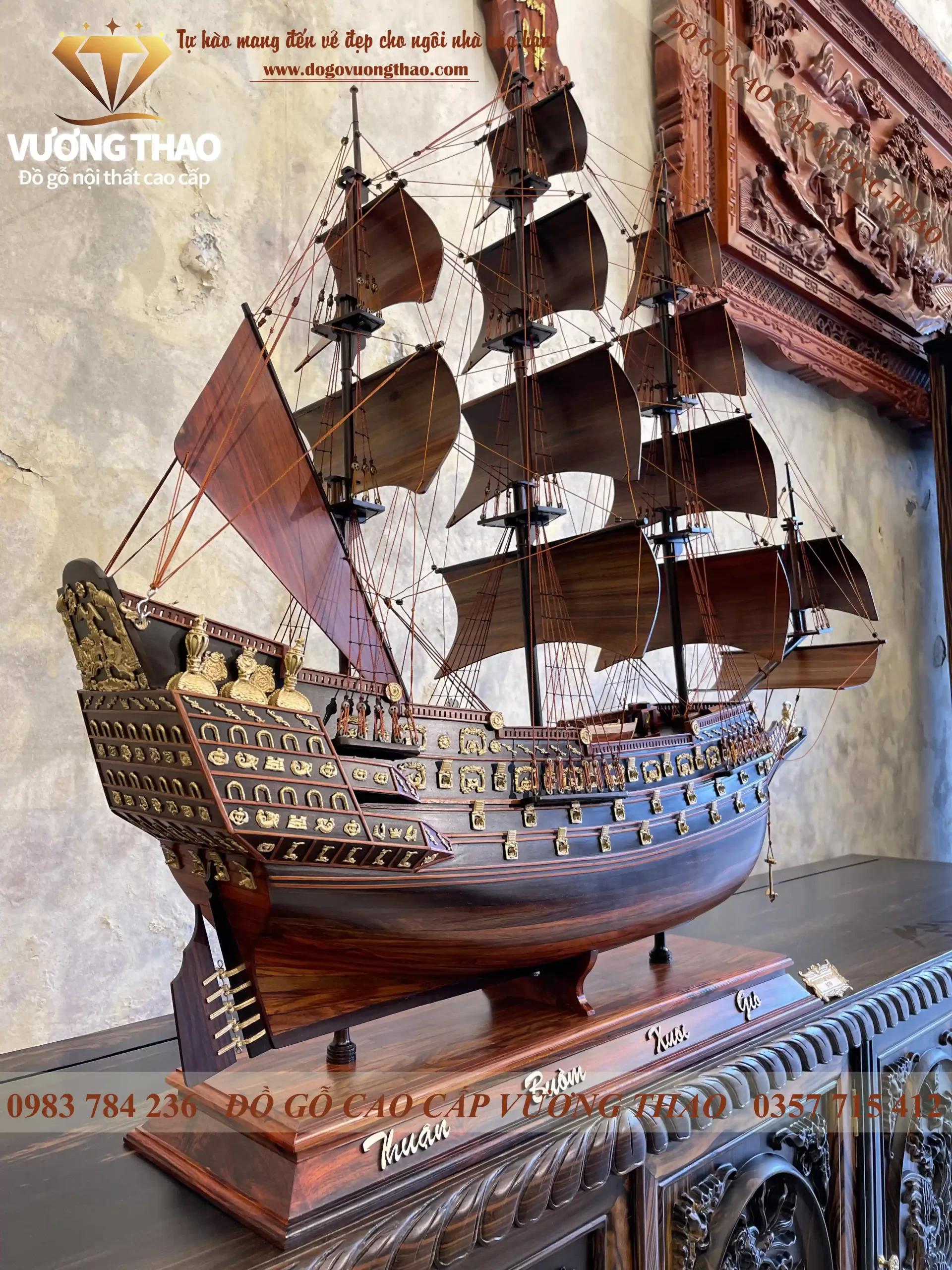 Mô hình thuyền buồm gỗ có kích thước N100 x S27 x C107cm. Với kích thước này Quý vị có thể để trên kệ tivi, tủ kệ trang trí đều rất đẹp. Ngoài ra, đồ gỗ Vương Thao còn có kích thước nhỏ hơn là N90 x S23 x C83cm và N50 x S10 x C47cm. Tất cả đều được làm từ chất liệu gỗ Mun hoa, phụ kiện đính trên đó làm từ đồng nguyên chất mạ vàng nên rất đẹp.