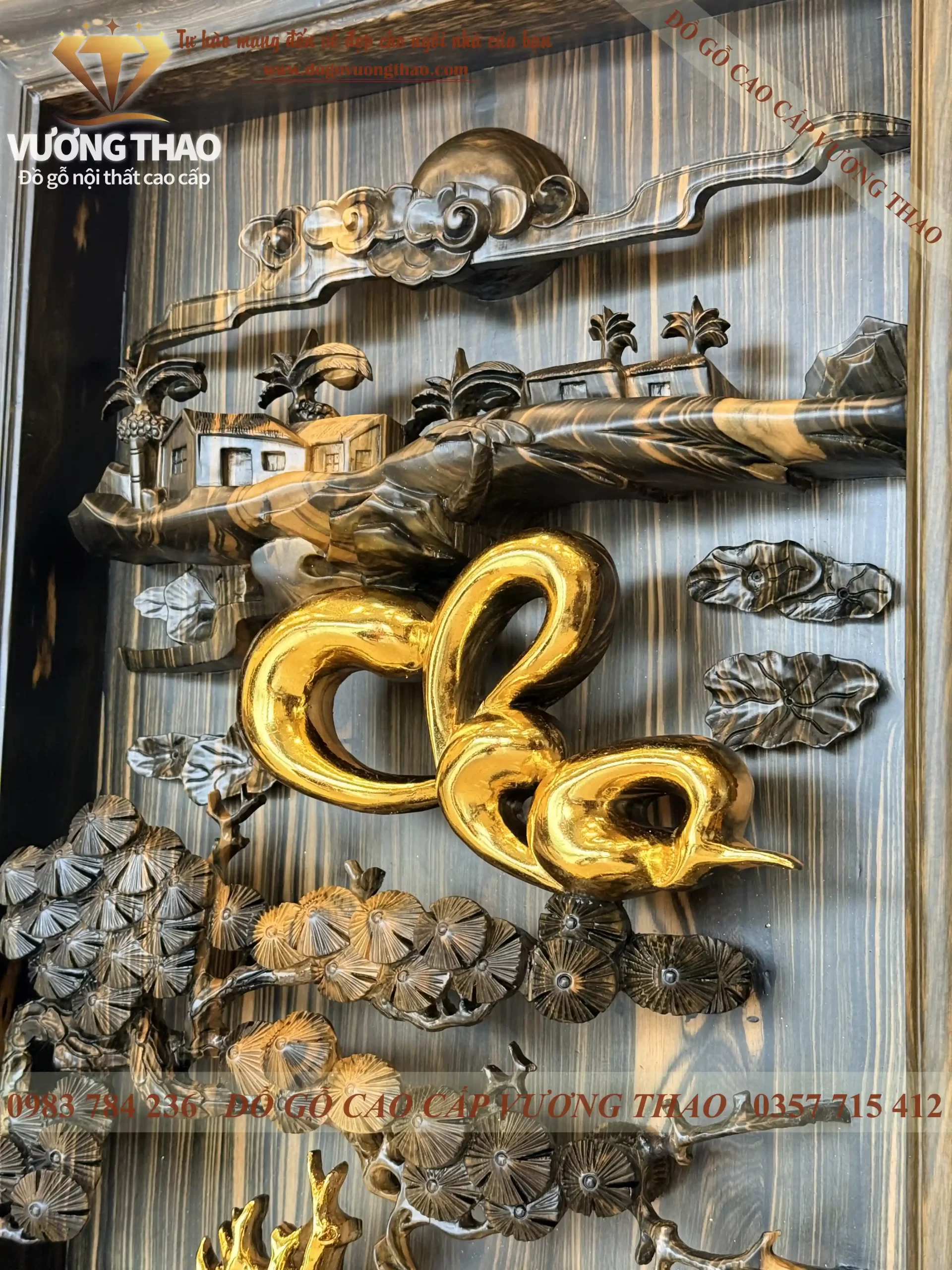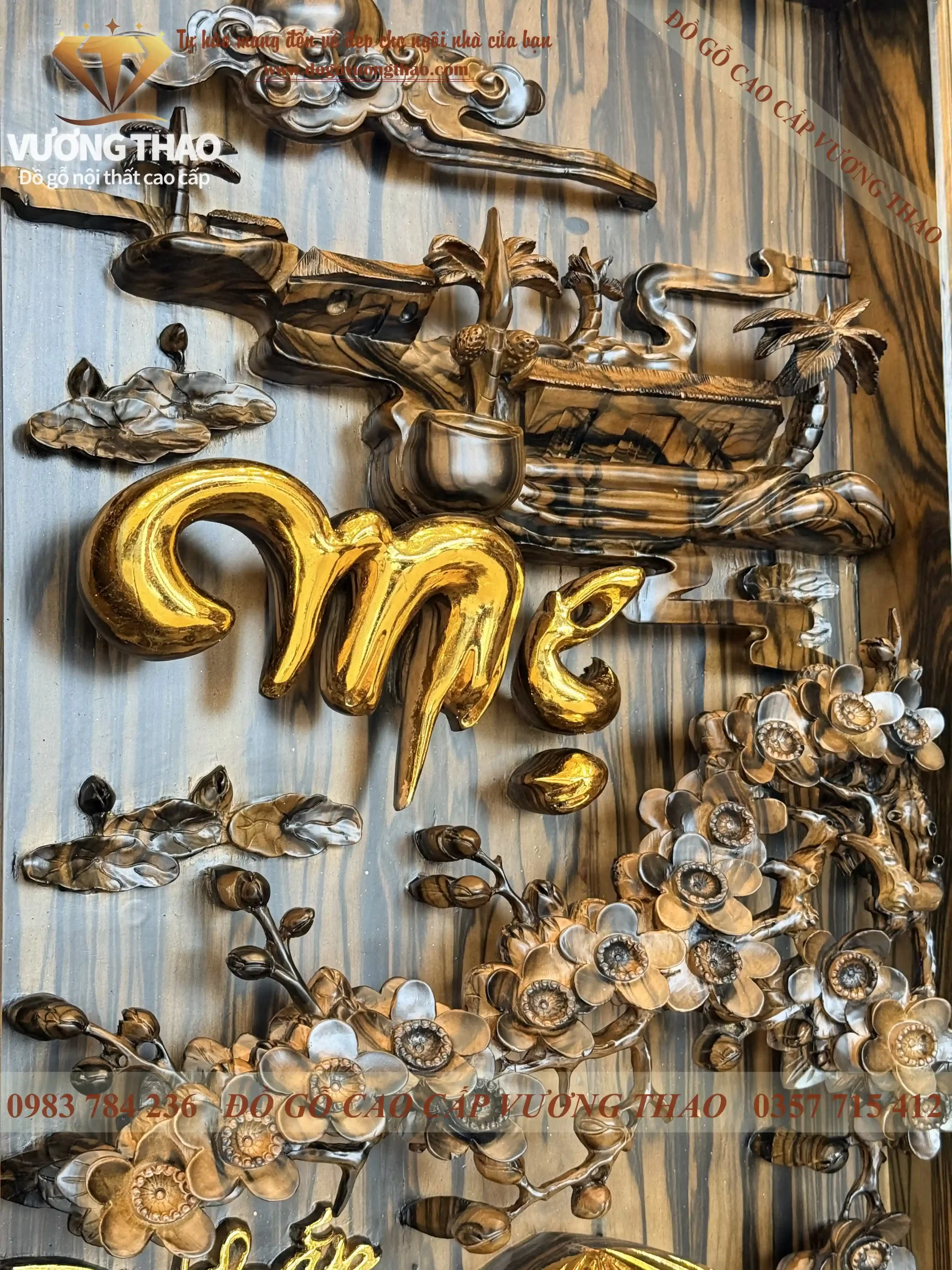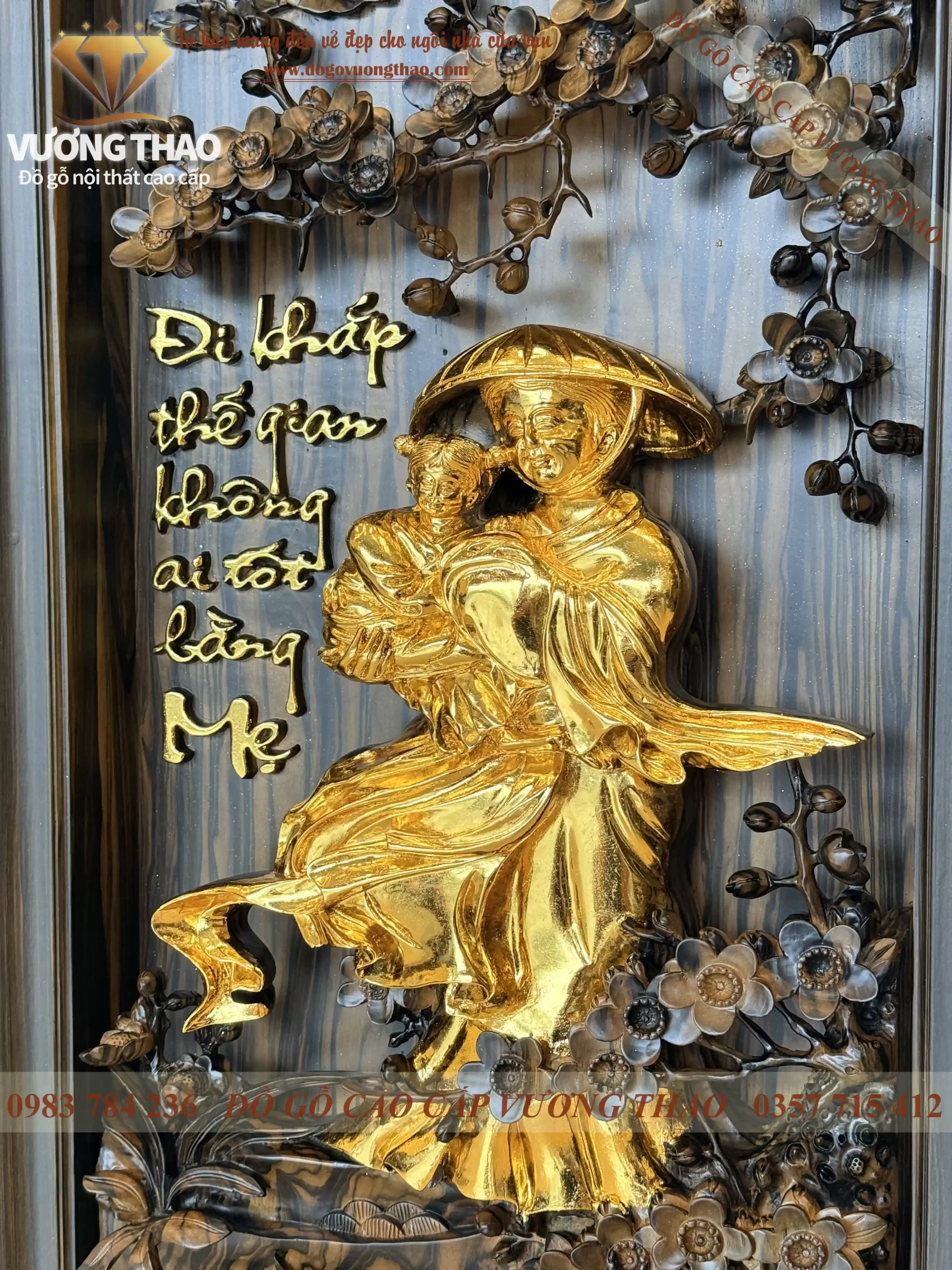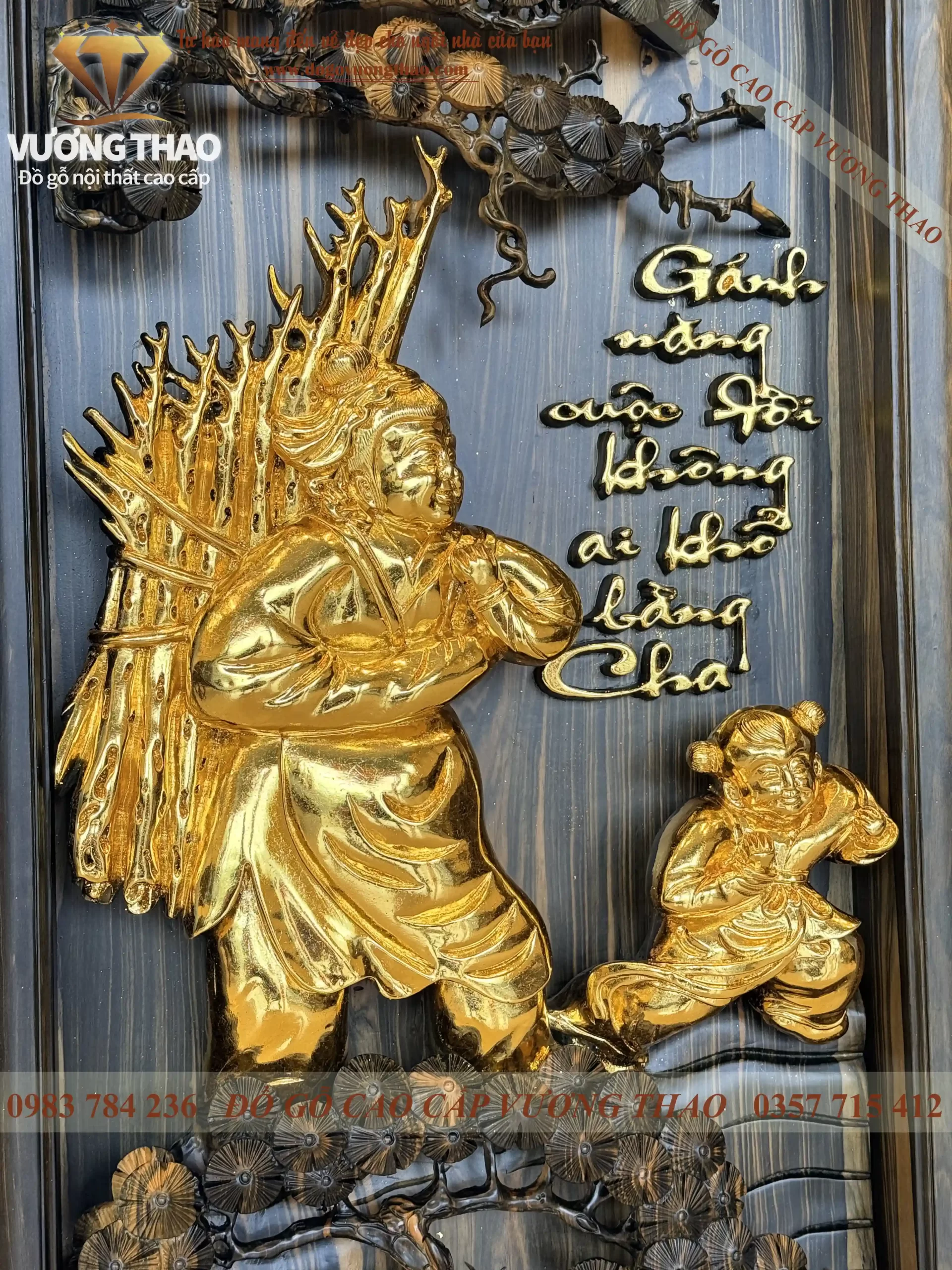Từng chi tiết từ vành nón lá của mẹ đến gánh củi trên vai cha đều được dát vàng lá 24K rực rỡ, tạo nên sự tương phản sang trọng trên nền gỗ Mun hoa đặc trưng. Đây không chỉ là một bức tranh, mà là một thông điệp về lòng biết ơn được khắc ghi vào gỗ đá.