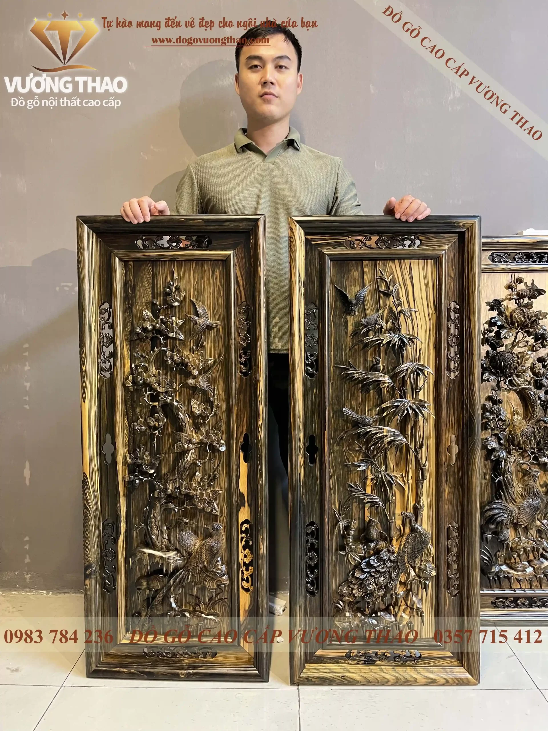 Bốn bức tranh được chạm theo chủ đề Tùng – Cúc – Trúc – Mai, tượng trưng cho khí chất bốn mùa và phẩm hạnh của người quân tử. Tùng vững chãi qua gió rét, Cúc nở đúng tiết thu, Trúc thẳng ngay dẫu mưa gió, Mai thanh khiết giữa mùa đông lạnh. Các chi tiết chim – hoa – cảnh – lá trên từng bức được chạm thủ công bằng tay, độ sâu tốt, nét đục sạch và có chiều khối, thể hiện rõ tay nghề của người thợ mỹ nghệ lâu năm.