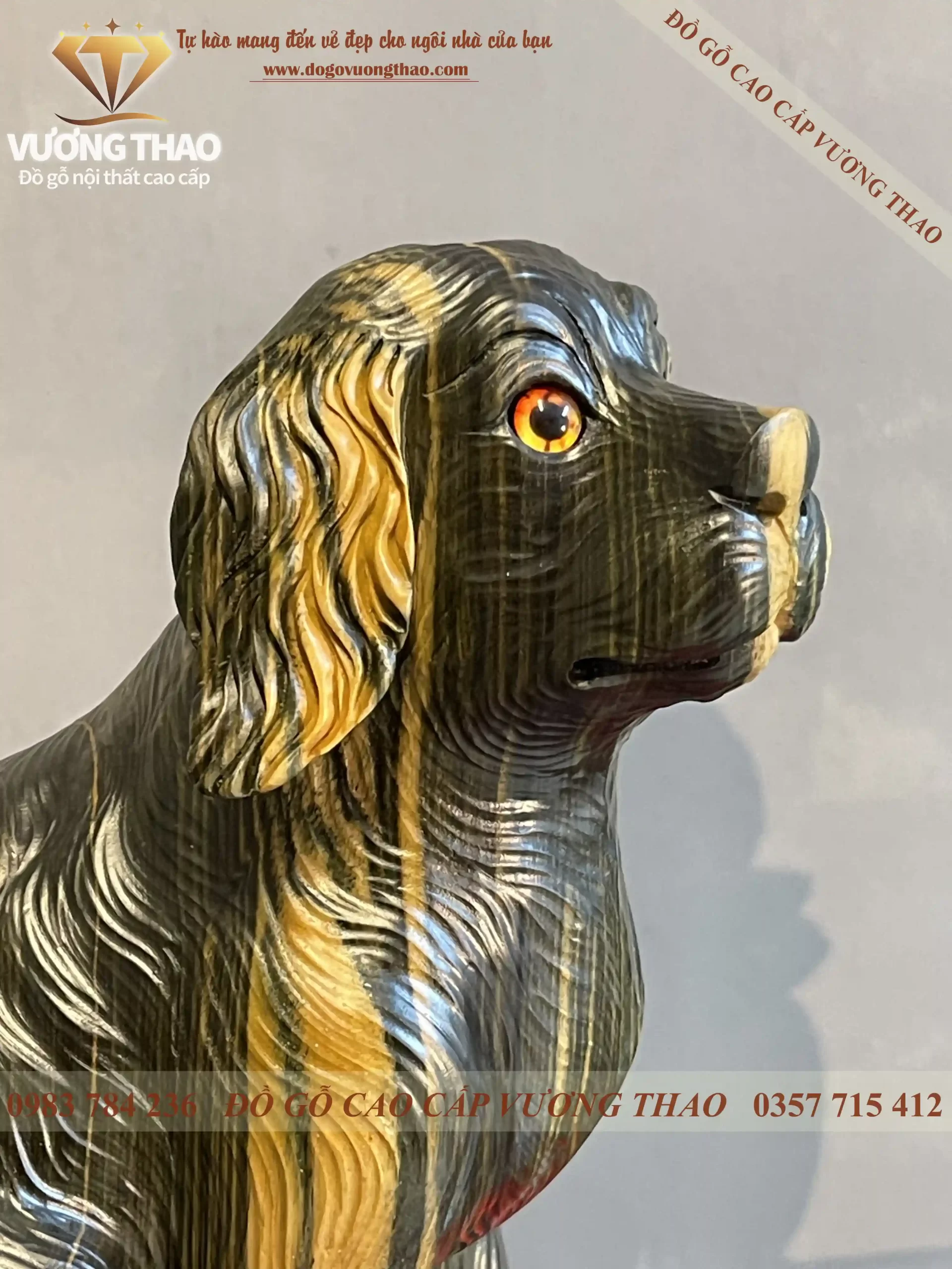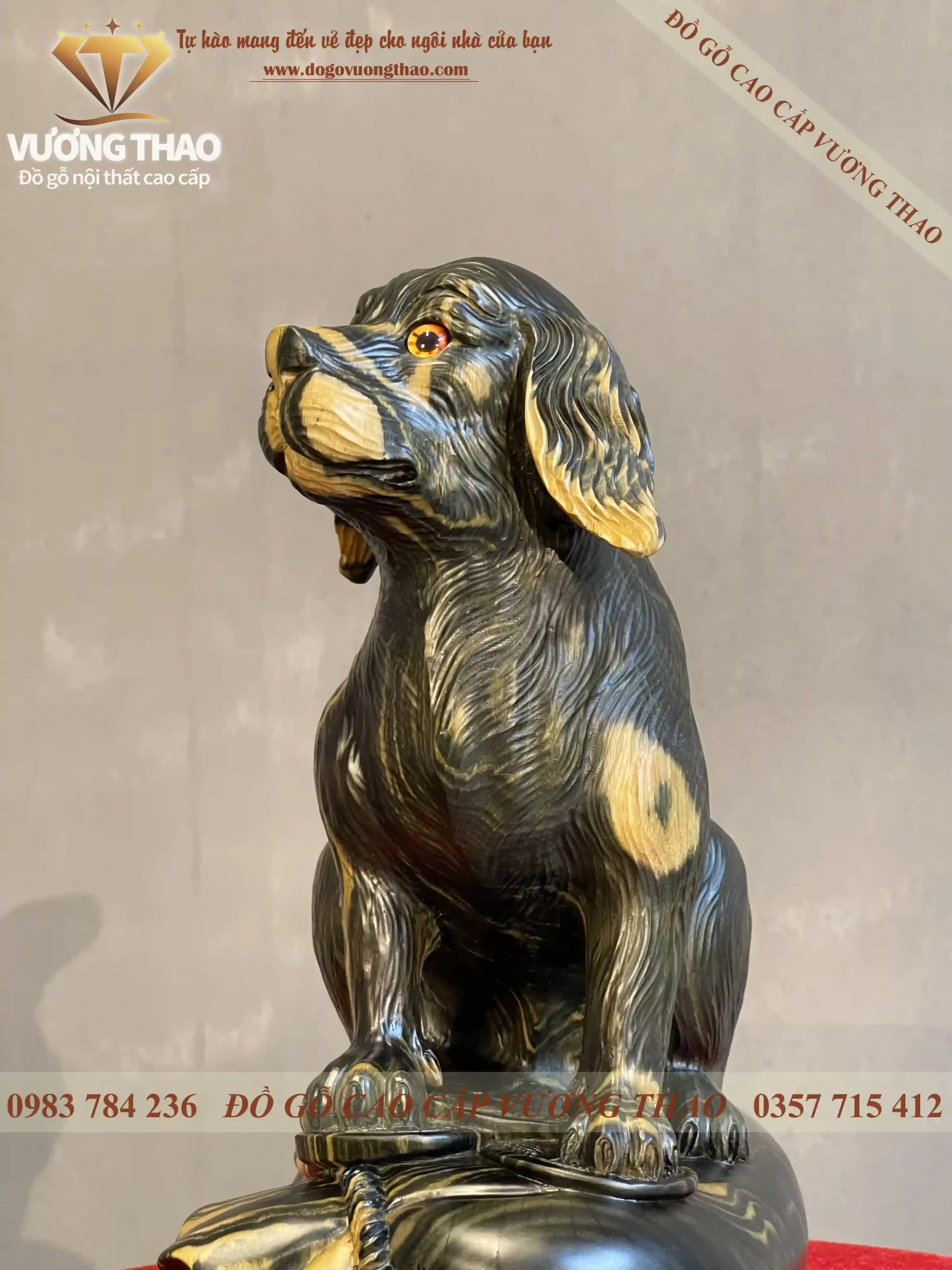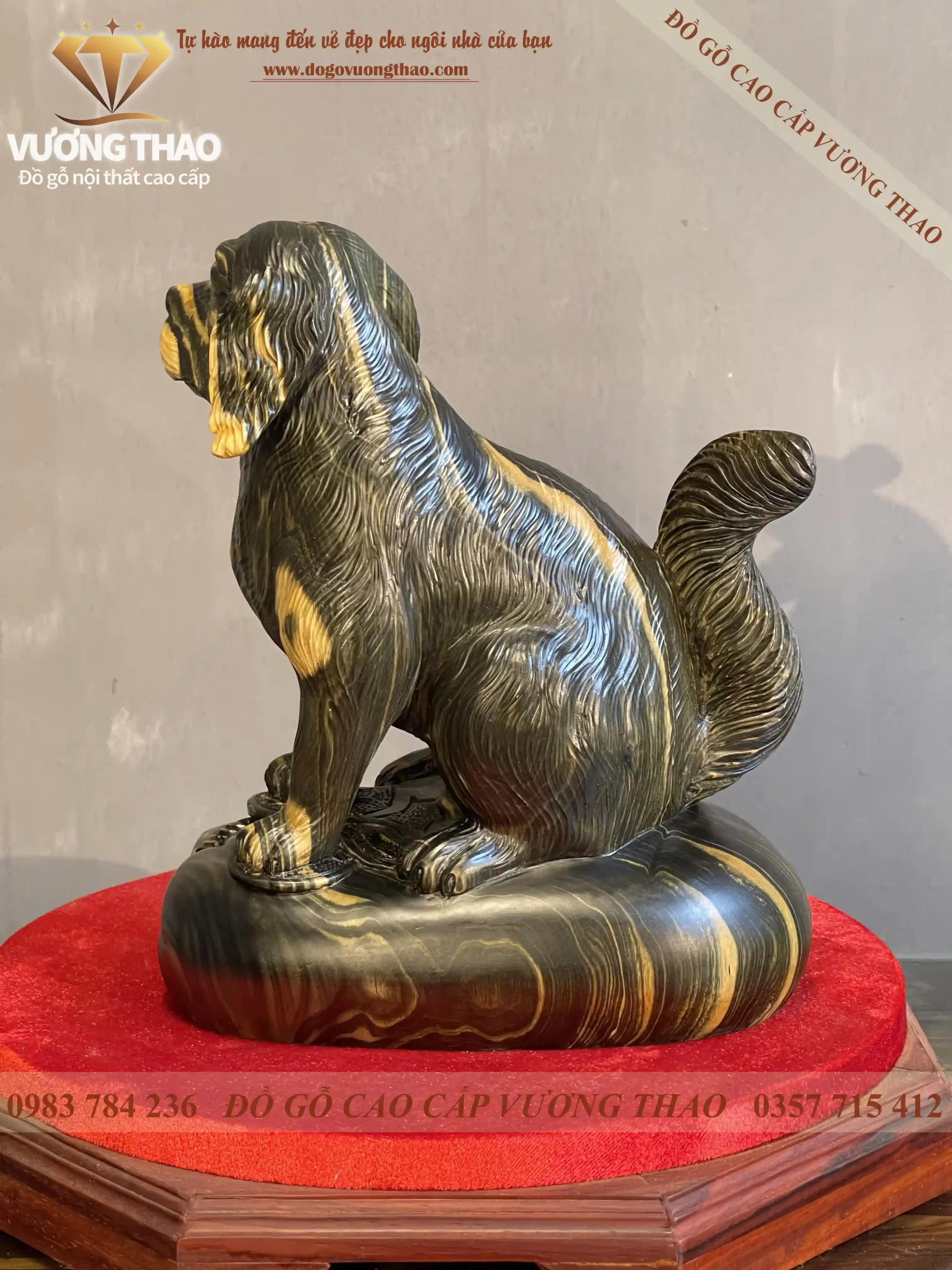 Tượng Chó phong thủy của đồ gỗ Vương Thao được làm trên chất liệu gỗ Mun hoa cao cấp. Có độ bền, chống cong vênh mối mọt theo thời gian, dùng càng lâu càng đẹp, càng lâu càng bóng càng giá trị. Tượng Chó gỗ Mun thuộc phân khúc hàng cao cấp của đồ gỗ Vương Thao.