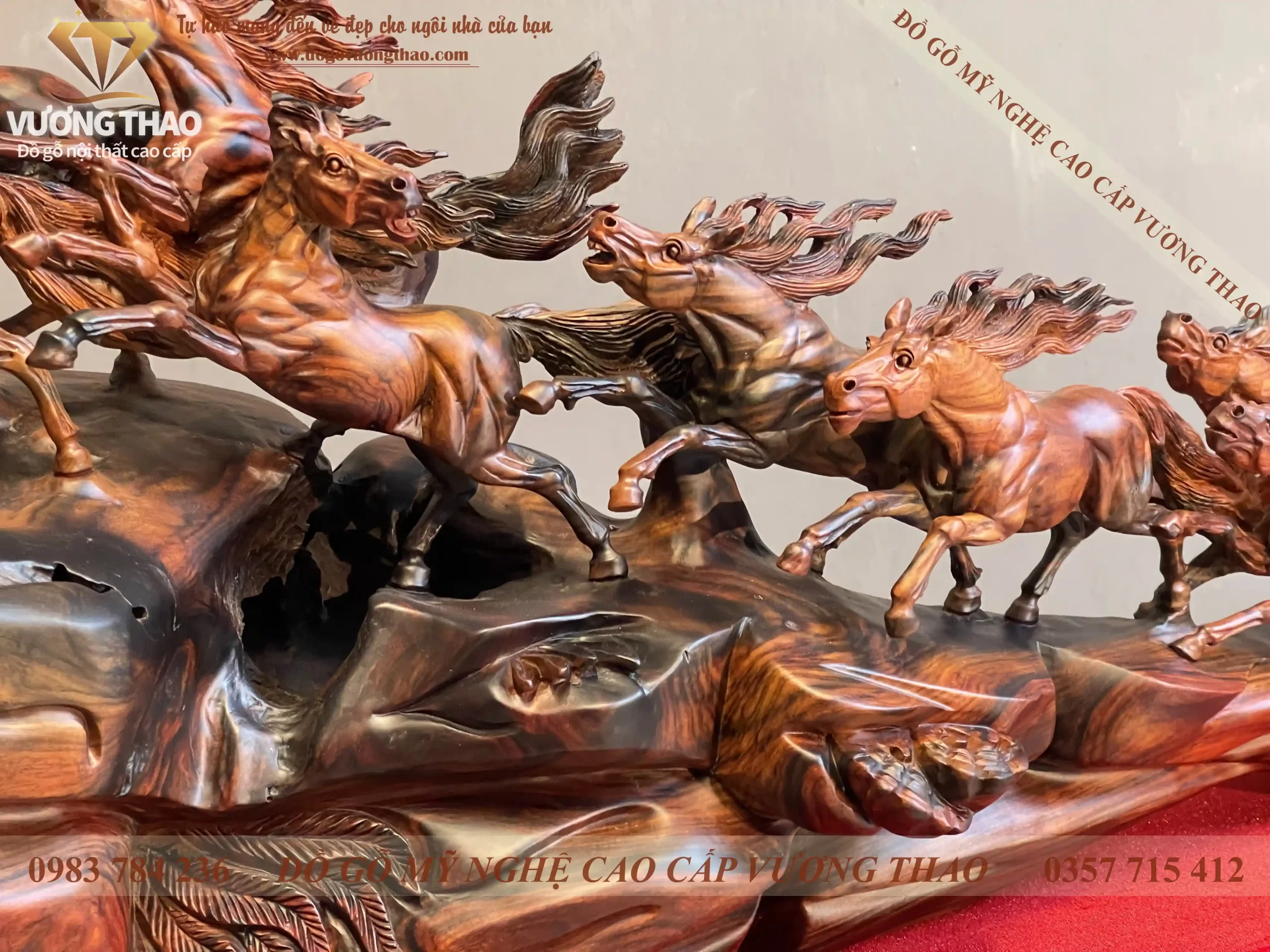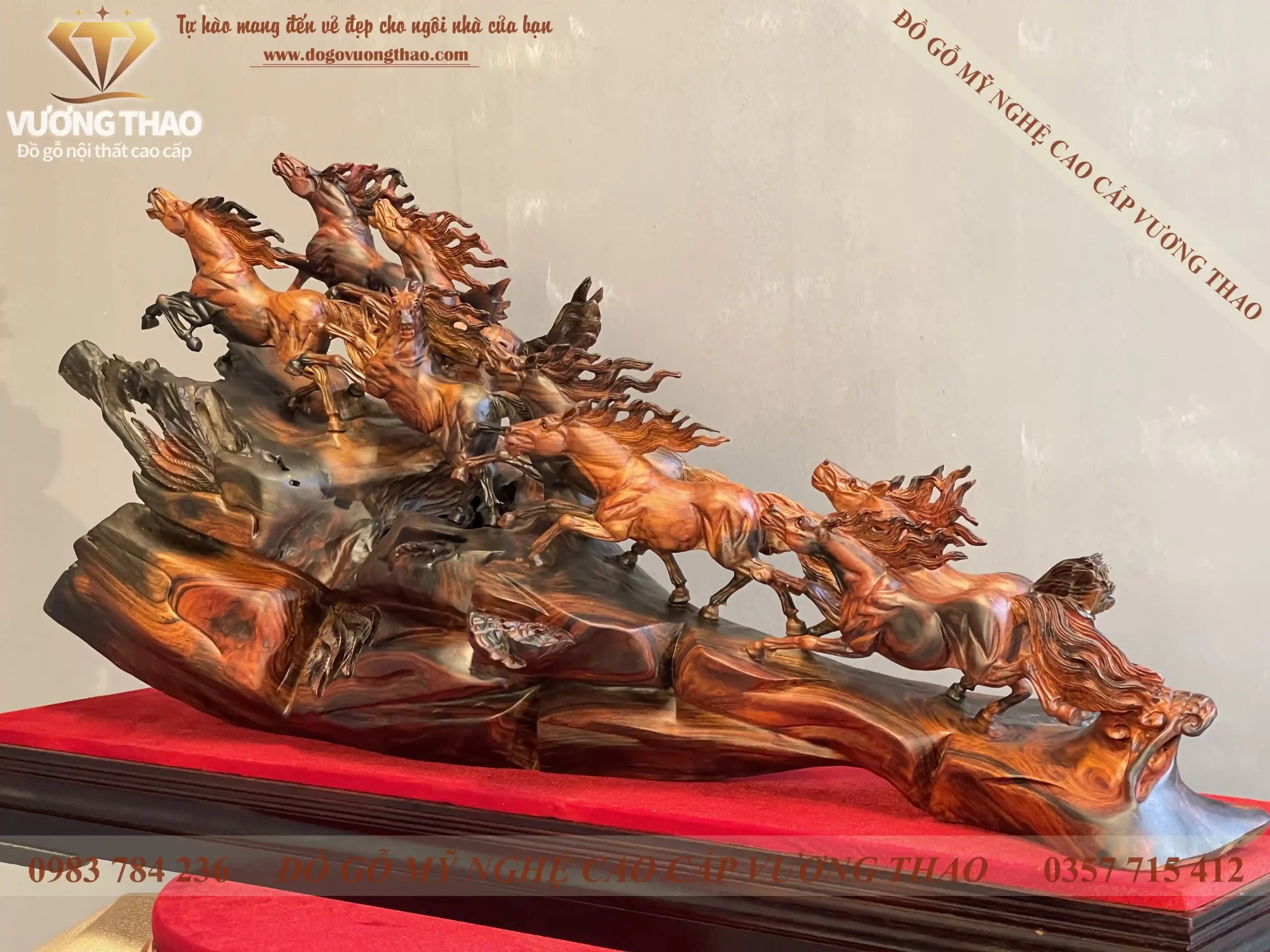 Bức tượng Mã Đáo Thành Công được chế tác trên chất liệu gỗ Mun hoa. Lấy hình ảnh 8 chú Ngựa phi trở về báo tin chiến thắng. Tượng Mã Đáo ra đời. Tượng Mã Đáo Thành Công gỗ Mun hoa thuộc phân khúc cao cấp của đồ gỗ Vương Thao.
