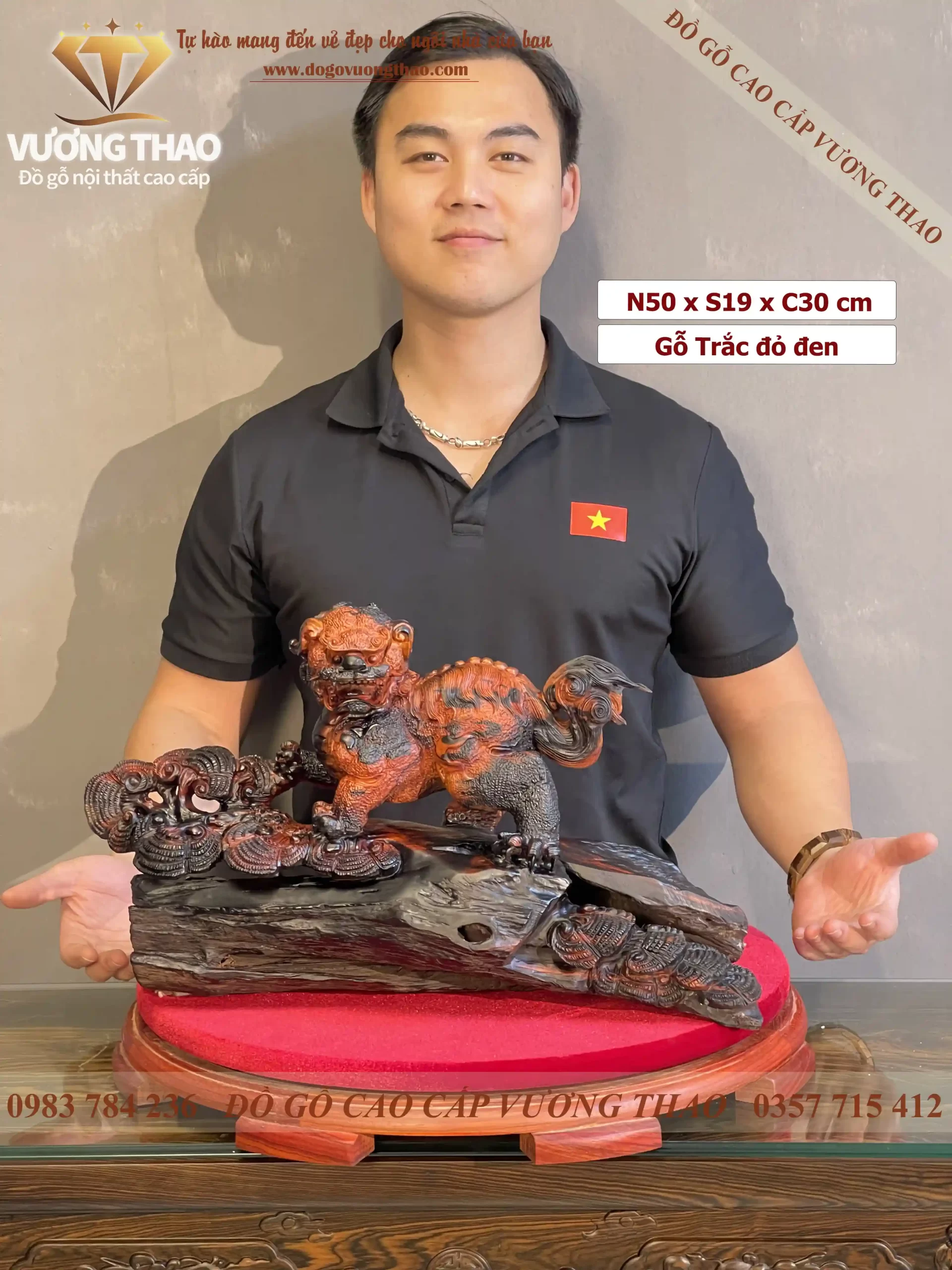 Tượng con Nghê được chế tác từ chất liệu gỗ Trắc đỏ đen cao cấp. Được đục tinh xảo từ gỗ nguyên khối có kích thước: N50 x S19 x C30cm(kỷ gỗ bọc nhung thêm 10cm). Tượng nổi bật với chi tiết thân hình mạnh mẽ, lưng khum, đuôi cong mang phong cách oai vệ. Đầu bức tượng Nghê gỗ Trắc sống động, biểu cảm uy nghi, tai dựng, miệng há – thể hiện tính cách hung giữ, trấn trạch trừ tà. Tượng Nghê gỗ Trắc là sản phẩm thuộc phân khúc cao cấp của đồ gỗ Vương Thao.